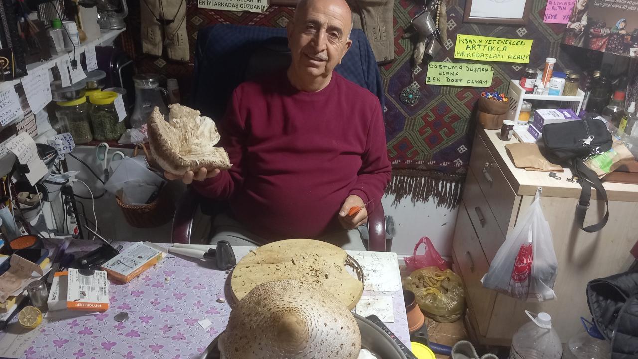 Konya'nın Seydişehir ilçesinde bulunan Kurtoğlu Kuruyemiş sahibi Ahmet Kurt’un işyerinde sergilenen dev mantar, vatandaşların yoğun ilgisini görüyor. Mantarın, Ahmet Kurt’un ağabeyi Talip Kurt tarafından bulunduğu öğrenildi.