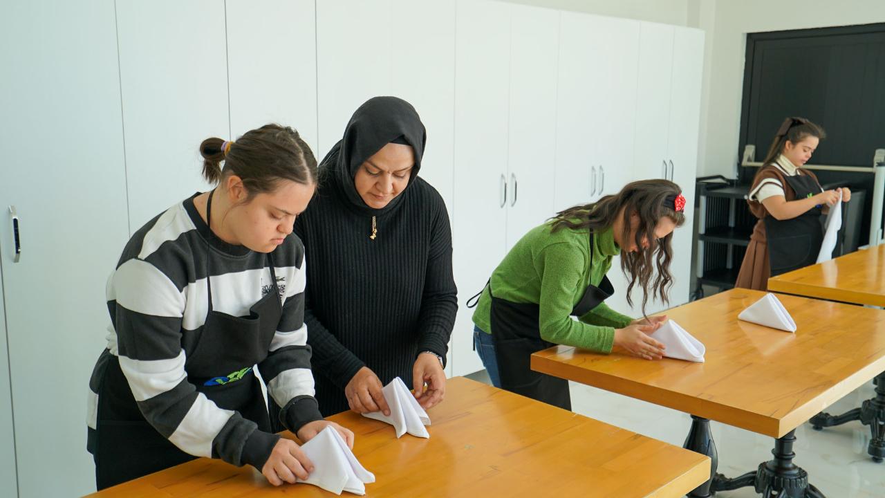 Merkezde down sendromlu bireyler için başlatılan komi (servis personeli) eğitim programı, özel bireylerin meslek edinmeleri ve iş hayatına katılmaları için umut dolu bir yolun kapısını aralıyor.