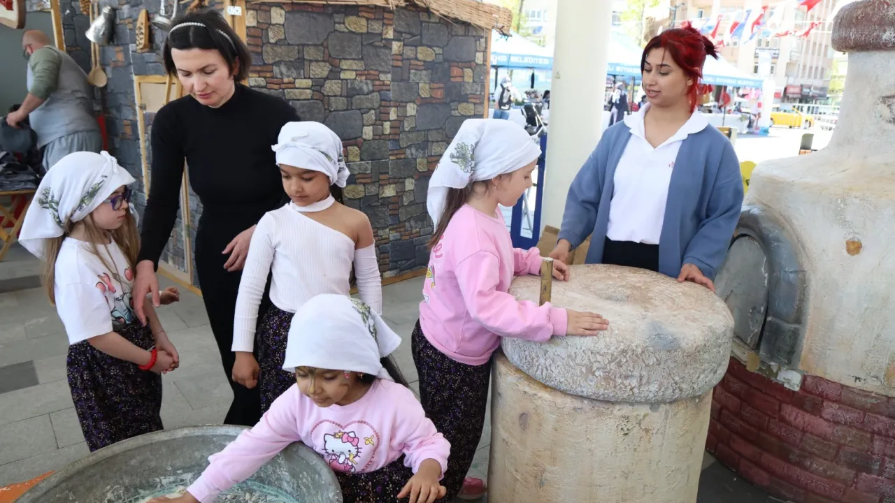 KOCAELİ - Kocaeli Büyükşehir Belediyesi'nin İzmit Milli İrade Meydanı’nda gerçekleştirdiği 23 Nisan Şenliği’nin dikkat çeken noktalarından biri olan “Somuncuklar Etkinlik Alanı”, köy hayatını yansıtan atmosferiyle çocukları geleneksel üretim süreçleriyle buluşturuyor. Minikler bu alanda, ekmeğin sofralara ulaşana kadar geçtiği tüm aşamaları uygulamalı olarak öğreniyor. Hamurun yoğrulmasından dinlendirilmesine, şekil verilmesinden odun fırınında pişirilmesine kadar uzanan süreç, çocuklar için hem öğretici hem de keyifli bir deneyime dönüşüyor.